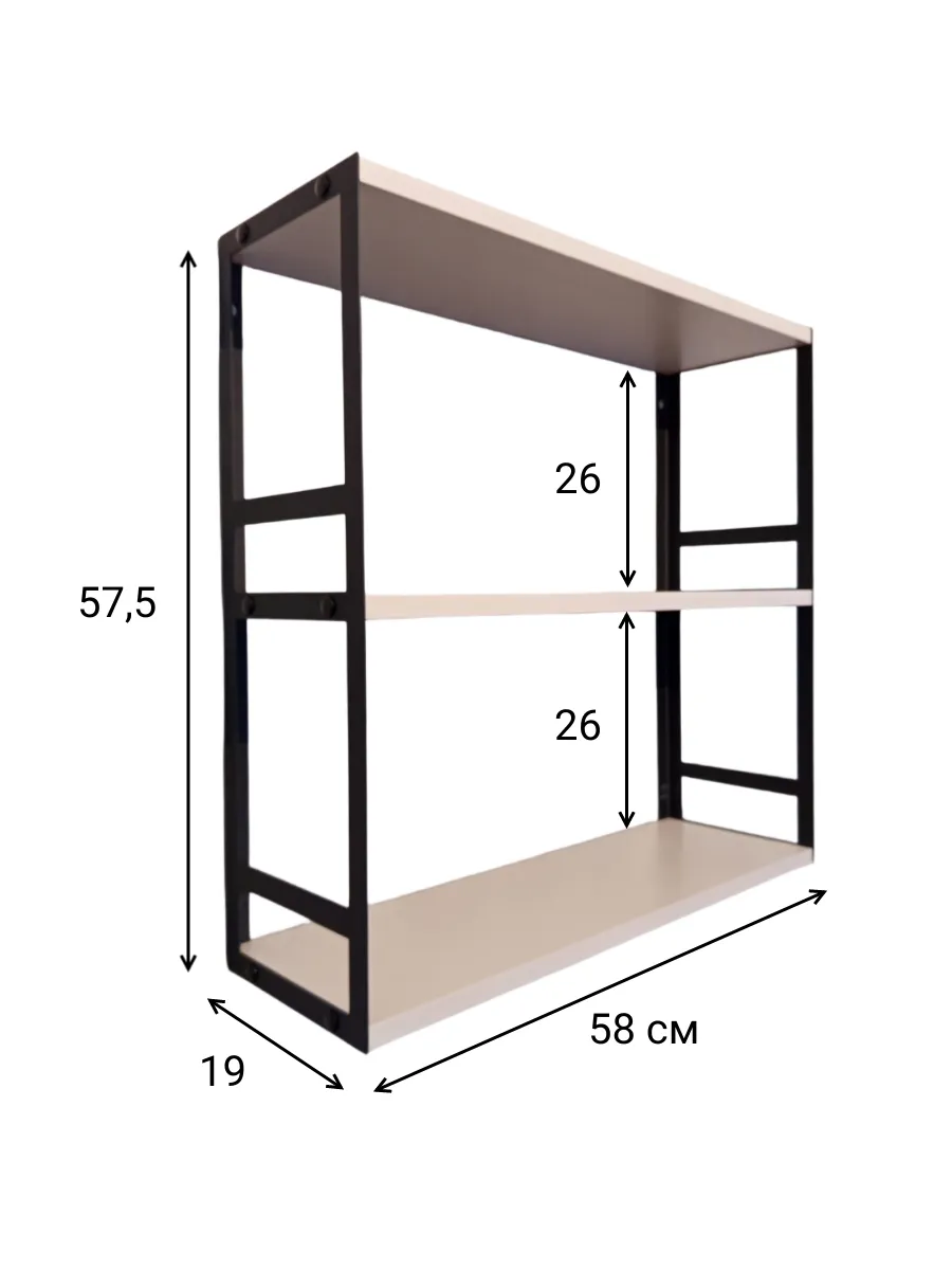 Стеллаж выполенен в виде трех открытых полочек из ЛДСП с прочными металлическими боковинами, покрытыми порошковой краской, устойчивой к механическим повреждениям и выцветанию. Толщина металла 1,5 мм. Это делает конструкцию крепкой и надежной, способной выдержать большую нагрузку.