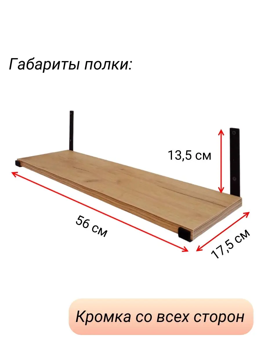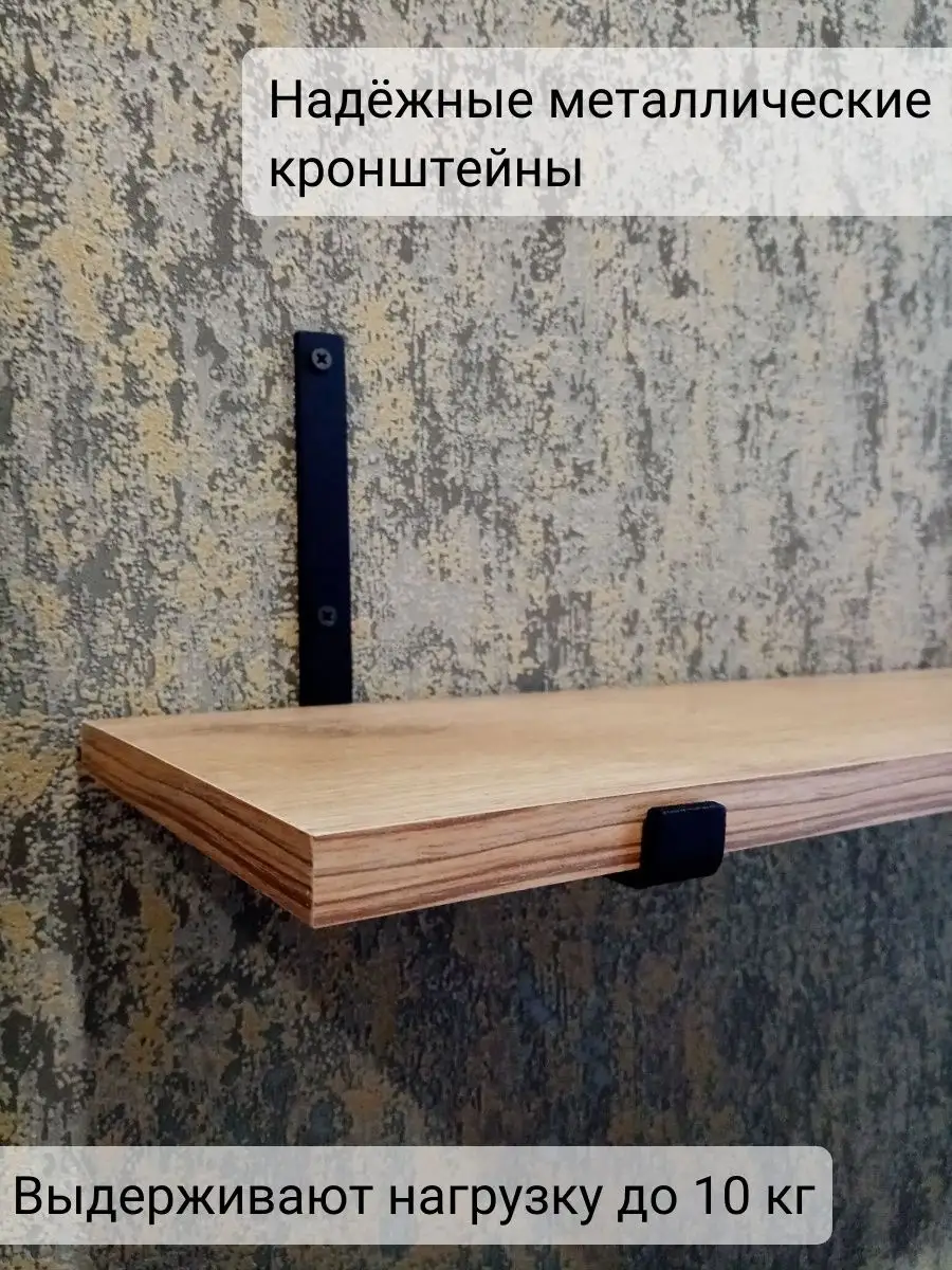 Полки изготовлены из ЛДСП безопасного класса, толщиной 16 мм. Металлические кронштейны покрыты матовой порошковой краской, устойчивой к повреждениям. Толщина металла 4 мм. Кронштейны качественно обработаны и зашлифованы, без зазубрин и заусенцев.