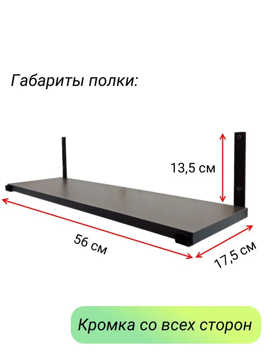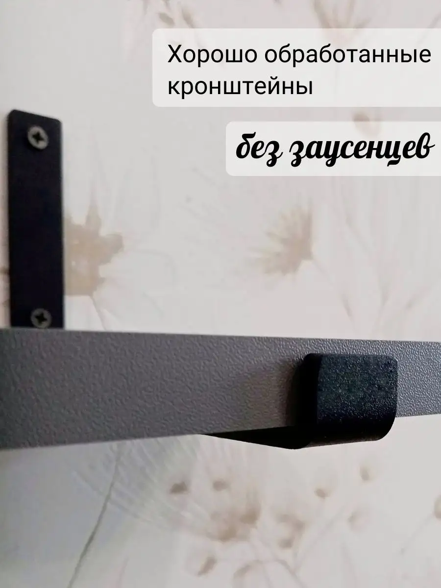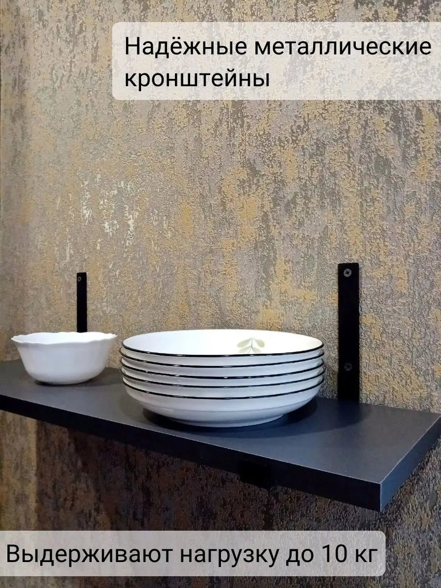 Полки изготовлены из ЛДСП безопасного класса, толщиной 16 мм. Металлические кронштейны покрыты матовой порошковой краской, устойчивой к повреждениям. Толщина металла 4 мм. Кронштейны качественно обработаны и зашлифованы, без зазубрин и заусенцев.