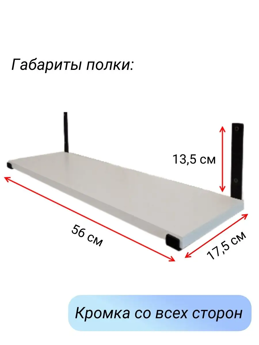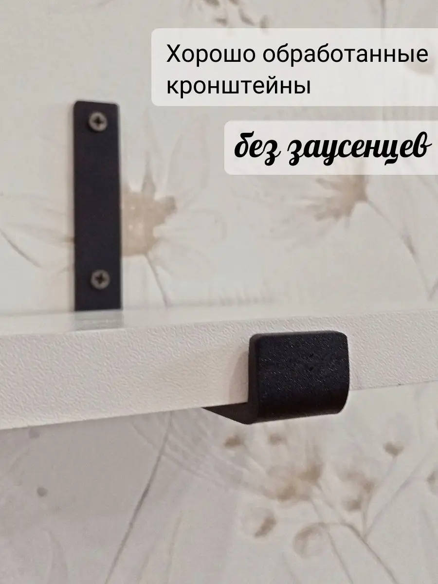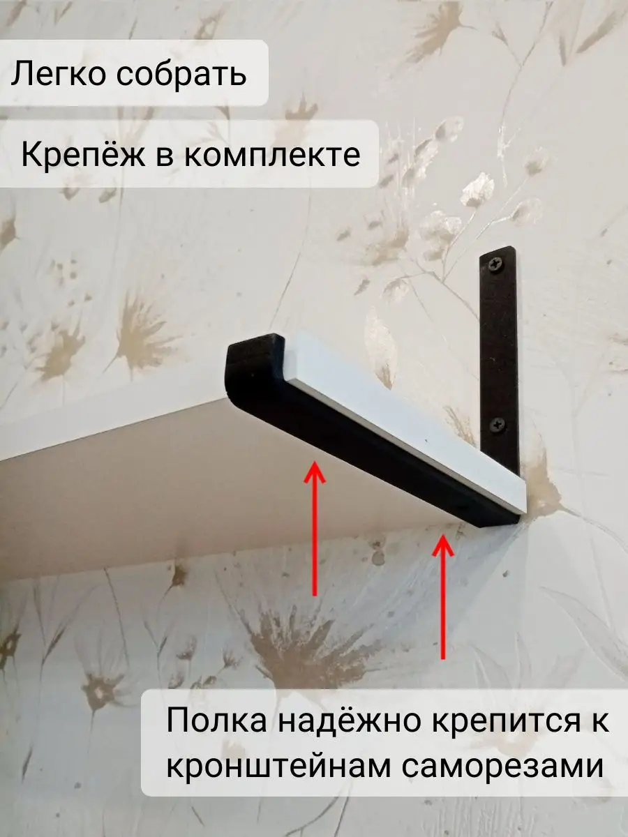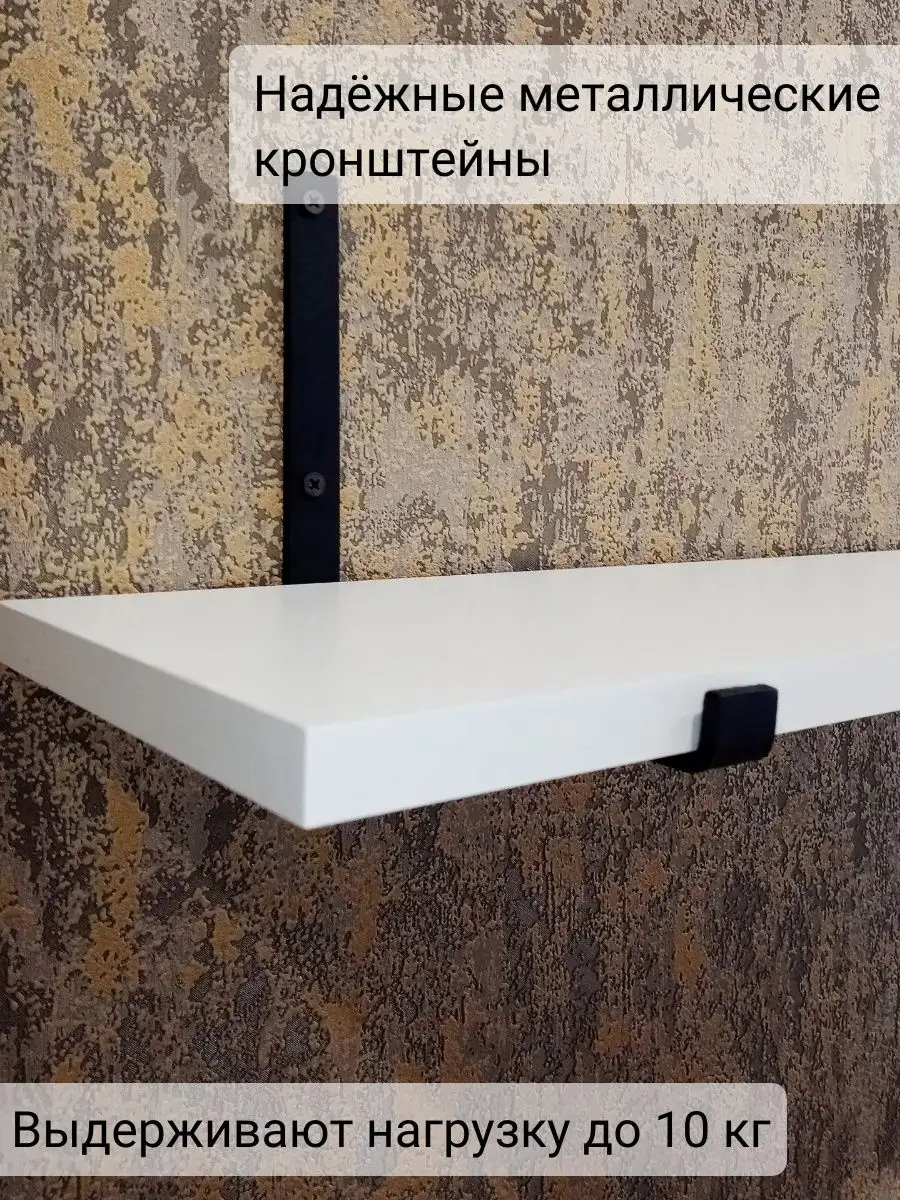 Полки изготовлены из ЛДСП безопасного класса, толщиной 16 мм. Металлические кронштейны покрыты матовой порошковой краской, устойчивой к повреждениям. Толщина металла 4 мм. Кронштейны качественно обработаны и зашлифованы, без зазубрин и заусенцев.
