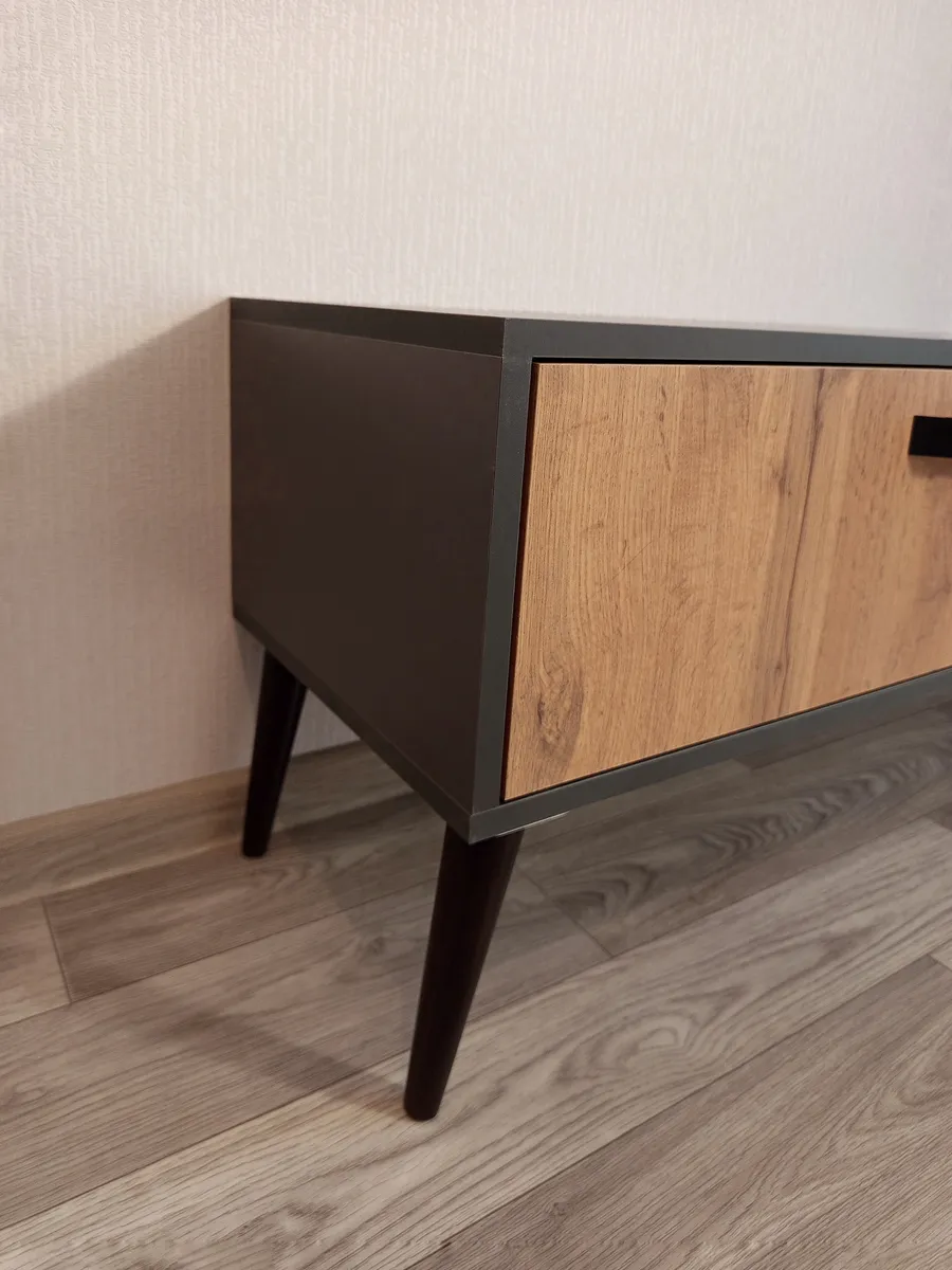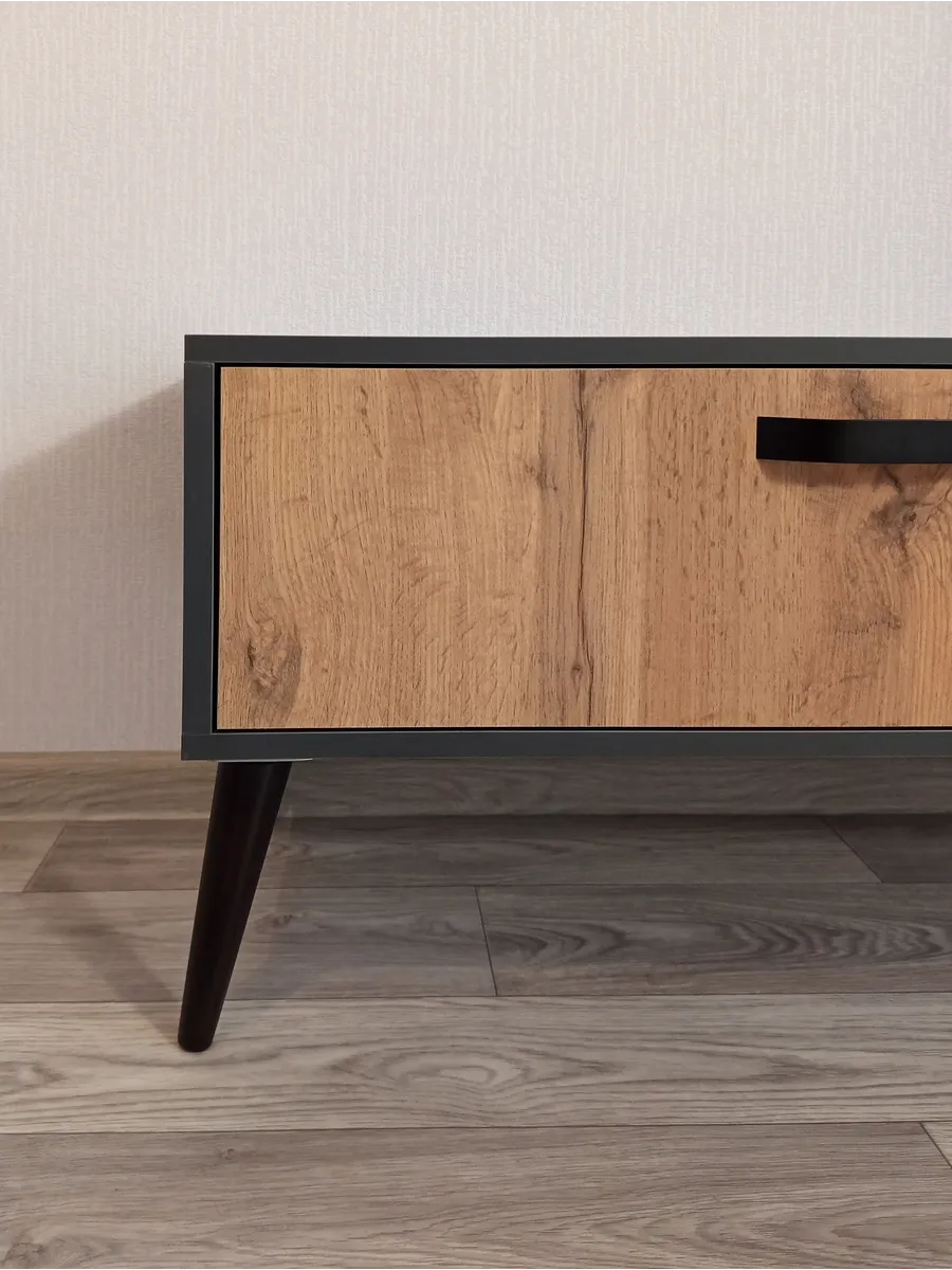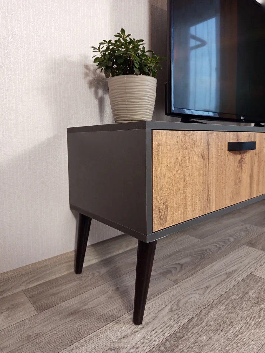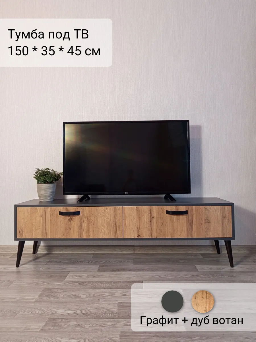 Тумба под телевизор "Венеция" - это идеальное решение для тех, кто хочет создать стильное и функциональное пространство перед своим домашним кинотеатром или игровой консолью. Эта модель отличается своей элегантностью и практичностью. Эффектная напольная тумба выполнена в современном стиле и дополнена ретро-ножками, которые придают ей изящество и приподнимают над полом. Два выдвижных ящика оснащены направляющими полного выдвижения, что обеспечивает легкий доступ к содержимому. Контрастные металлические ручки дополняют фасады ящиков выразительными акцентами. Основные характеристики: - Размеры: Ширина 150 см, высота 40 см (вместе с ножками), глубина 35 см. - Материал: Корпус изготовлен из ЛДСП, опоры изготовлены из натурального бука, что обеспечивает долговечность и прочность конструкции. - Дополнительные особенности: Наличие ящиков делает тумбу удобной для хранения различных вещей, таких как провода, DVD-диски и другие аксессуары. Высокое качество материалов и точная сборка гарантируют долгий срок службы.