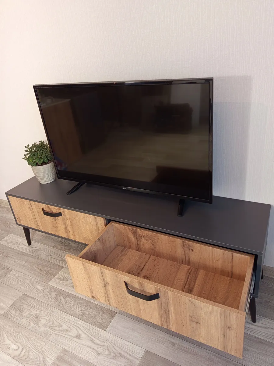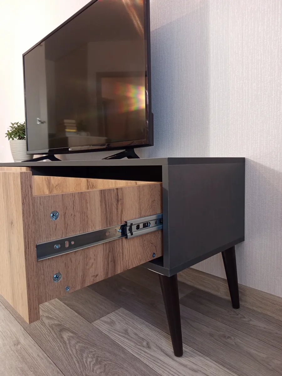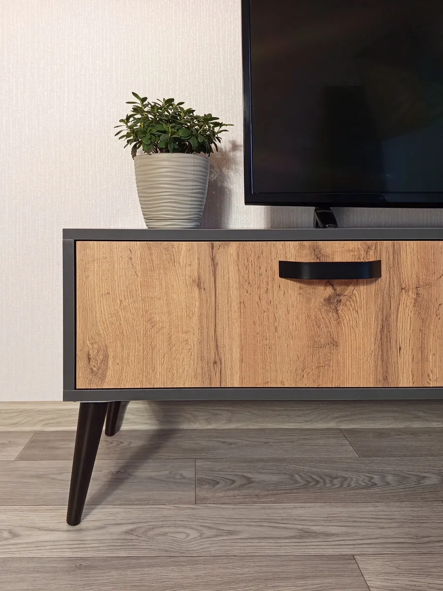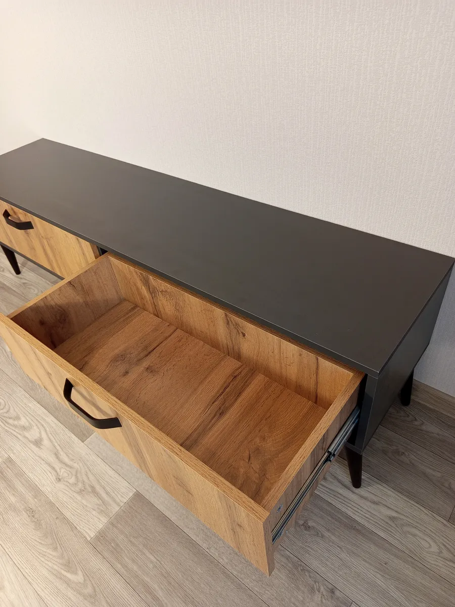 Тумба под телевизор "Венеция" - это идеальное решение для тех, кто хочет создать стильное и функциональное пространство перед своим домашним кинотеатром или игровой консолью. Эта модель отличается своей элегантностью и практичностью. Эффектная напольная тумба выполнена в современном стиле и дополнена ретро-ножками, которые придают ей изящество и приподнимают над полом. Два выдвижных ящика оснащены направляющими полного выдвижения, что обеспечивает легкий доступ к содержимому. Контрастные металлические ручки дополняют фасады ящиков выразительными акцентами. Основные характеристики: - Размеры: Ширина 150 см, высота 40 см (вместе с ножками), глубина 35 см. - Материал: Корпус изготовлен из ЛДСП, опоры изготовлены из натурального бука, что обеспечивает долговечность и прочность конструкции. - Дополнительные особенности: Наличие ящиков делает тумбу удобной для хранения различных вещей, таких как провода, DVD-диски и другие аксессуары. Высокое качество материалов и точная сборка гарантируют долгий срок службы.