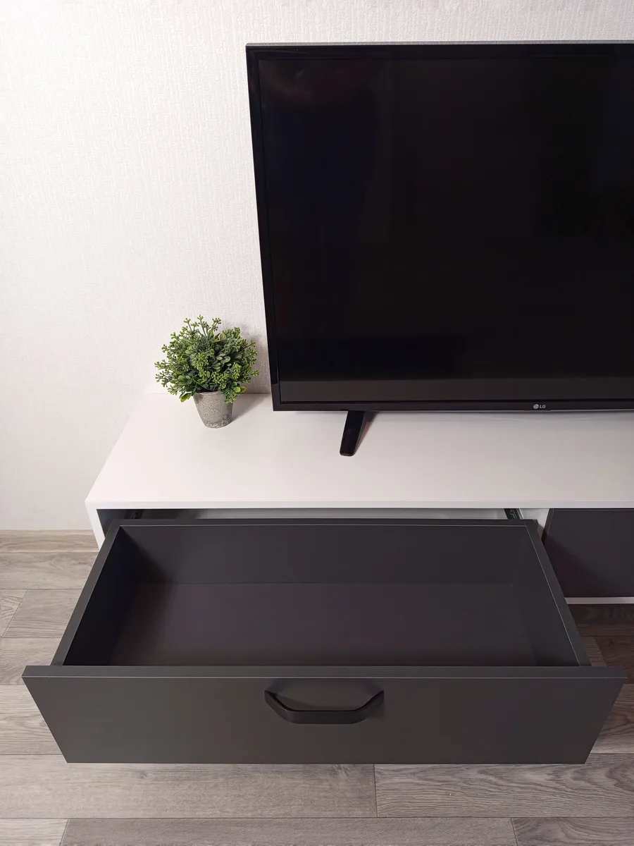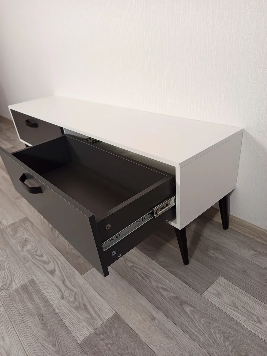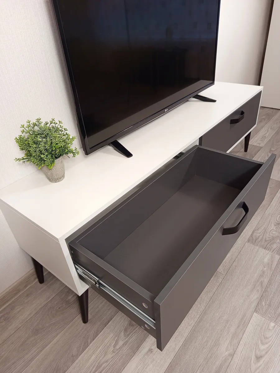 - Дополнительные особенности: Наличие ящиков делает тумбу удобной для хранения различных вещей, таких как провода, DVD-диски и другие аксессуары.