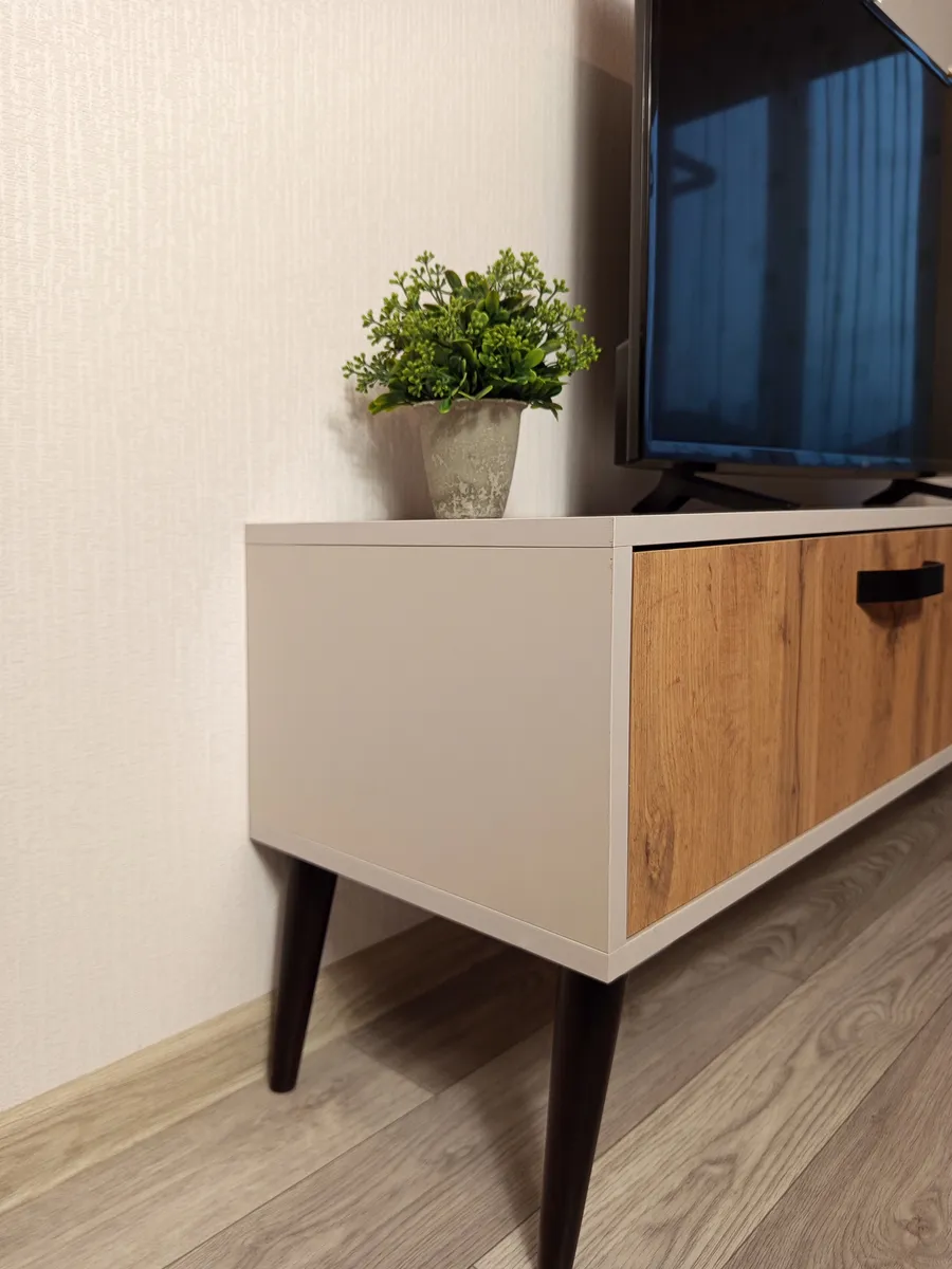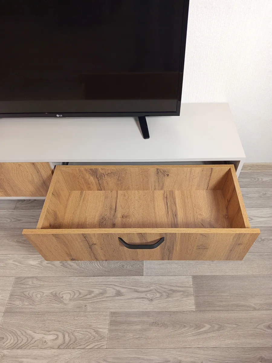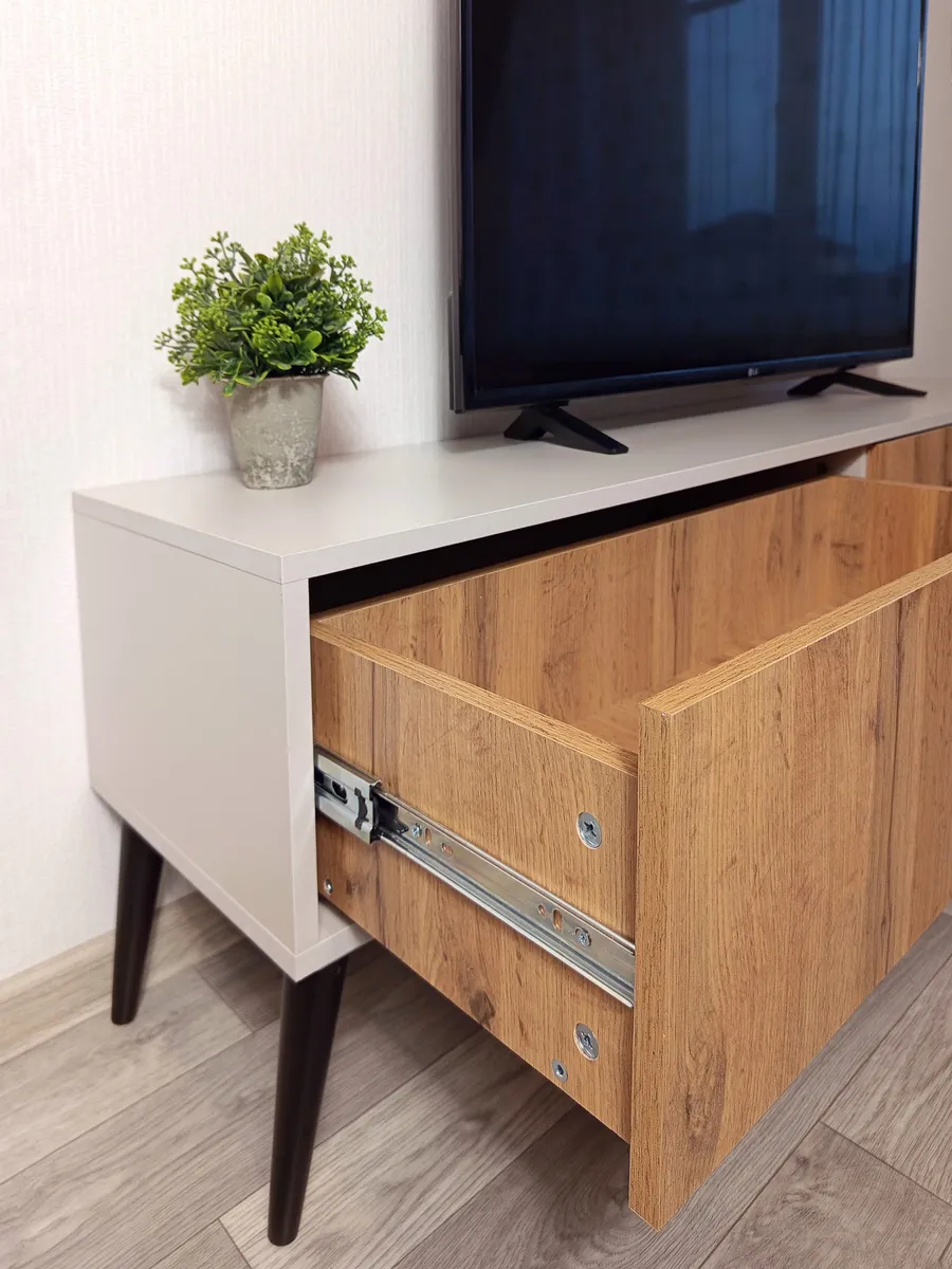 - Дополнительные особенности: Наличие ящиков делает тумбу удобной для хранения различных вещей, таких как провода, DVD-диски и другие аксессуары.